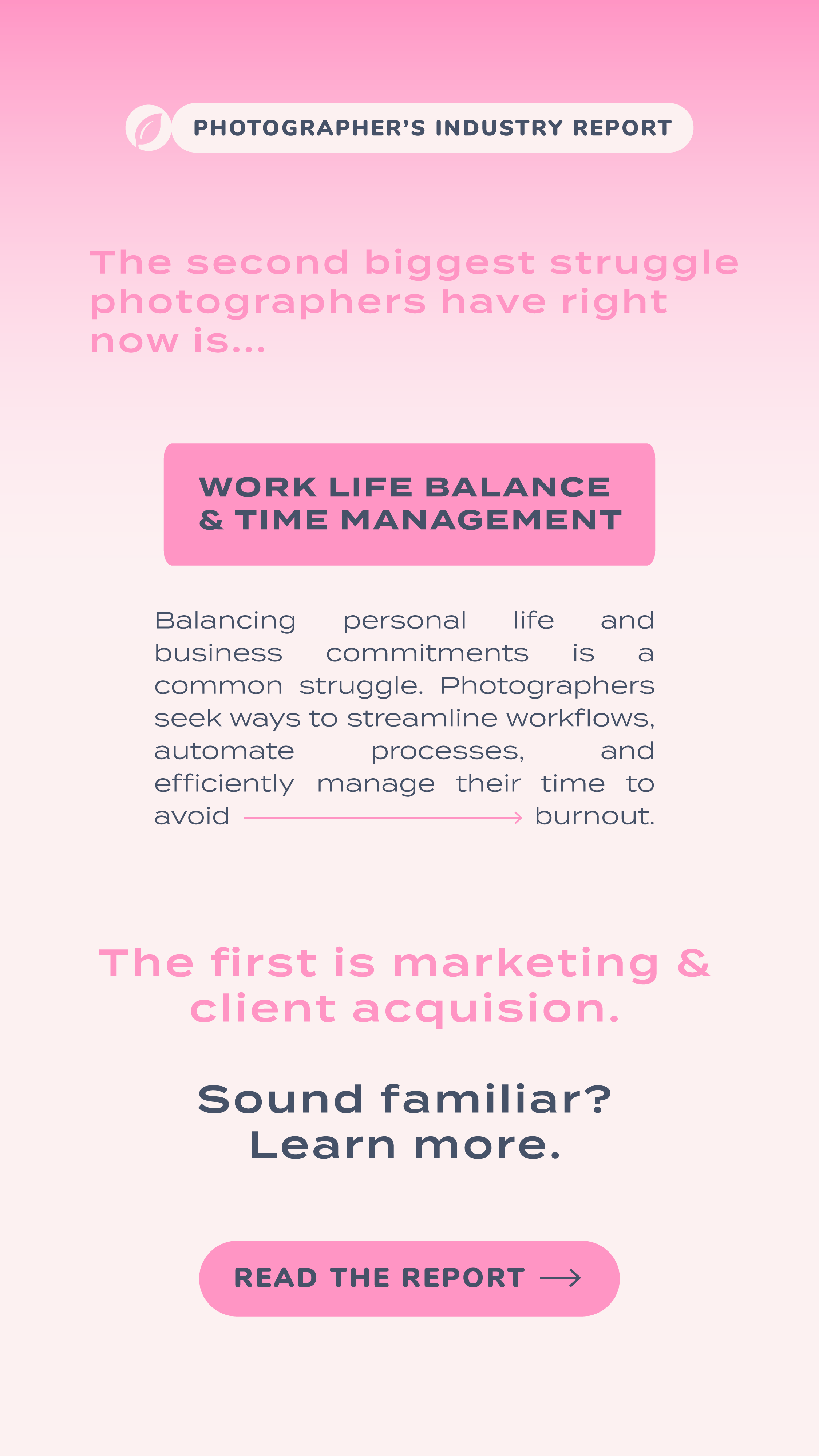 Right now, the most pressing and time-sensitive issue photographers face is marketing and client acquisition. With the photography industry facing shifts in demand and competition, photographers need to address their marketing strategies urgently to attract new clients and maintain a consistent flow of bookings.